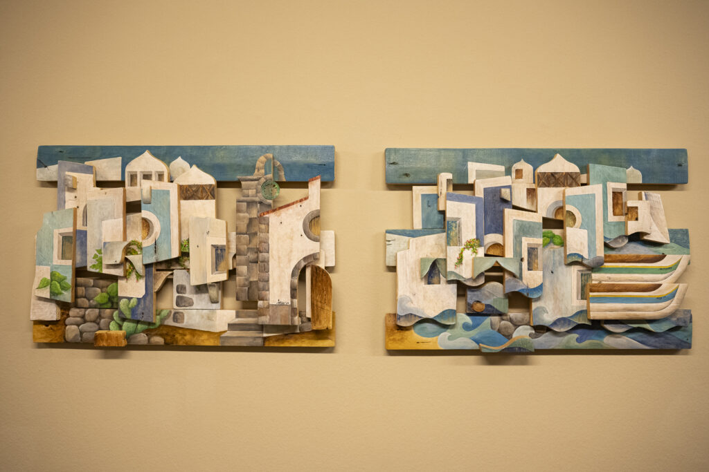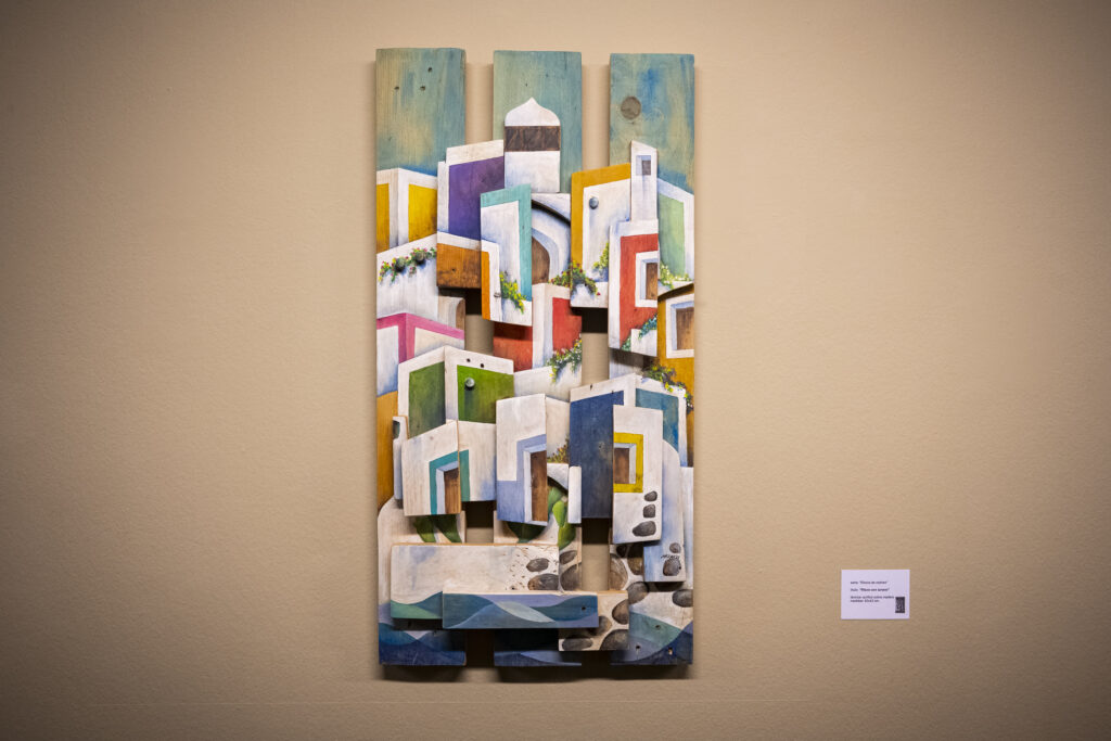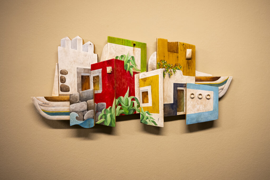 JJ: Como ya mencioné, siempre fueron los riscos de los recuerdos infantiles y sus edificaciones un tema recurrente en mis dibujos y pinturas anteriores, que luego ya plasmé sobre madera de palé para esta serie de “Riscos de colores”