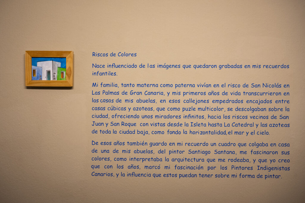 <<…guardo en mi recuerdo un cuadro que colgaba en casa de una de mis abuelas, del pintor Santiago Santana, amigo de uno de mis abuelos. Me fascinaron sus colores, cómo interpretaba la arquitectura que me rodeaba y que yo creo que con los años, marcó mi fascinación por los Pintores Indigenistas Canarios, y creo que han influenciado la forma que tengo de pintar.>>
